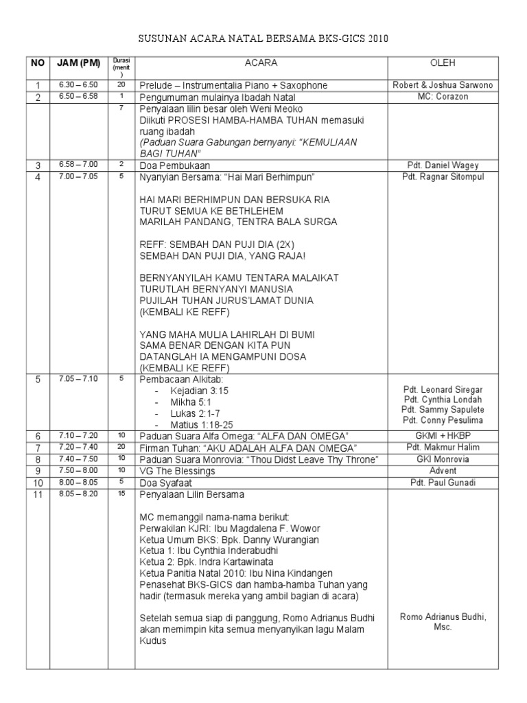 Itulah susunan acara pada hari ini, namun sebelum kita lanjutkan kepada acara berikutnya. Contoh susunan acara natal terbaru. Perayaan natal yang sukses tentu akan terjadi apabila adanya kerjasama antara gembala dan seluruh jemaat serta persiapan yang matang. Ini contoh susunan acara natal pemudadeskripsi lengkap. Susunan acara natalpnb, remaja dan sidi 2014.